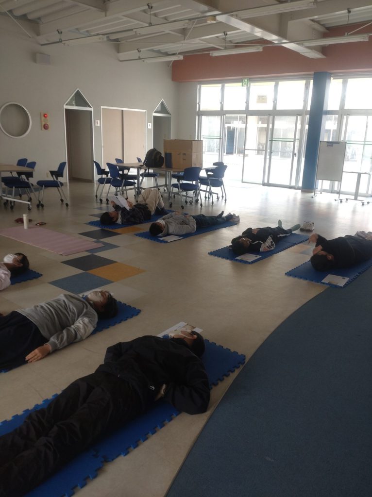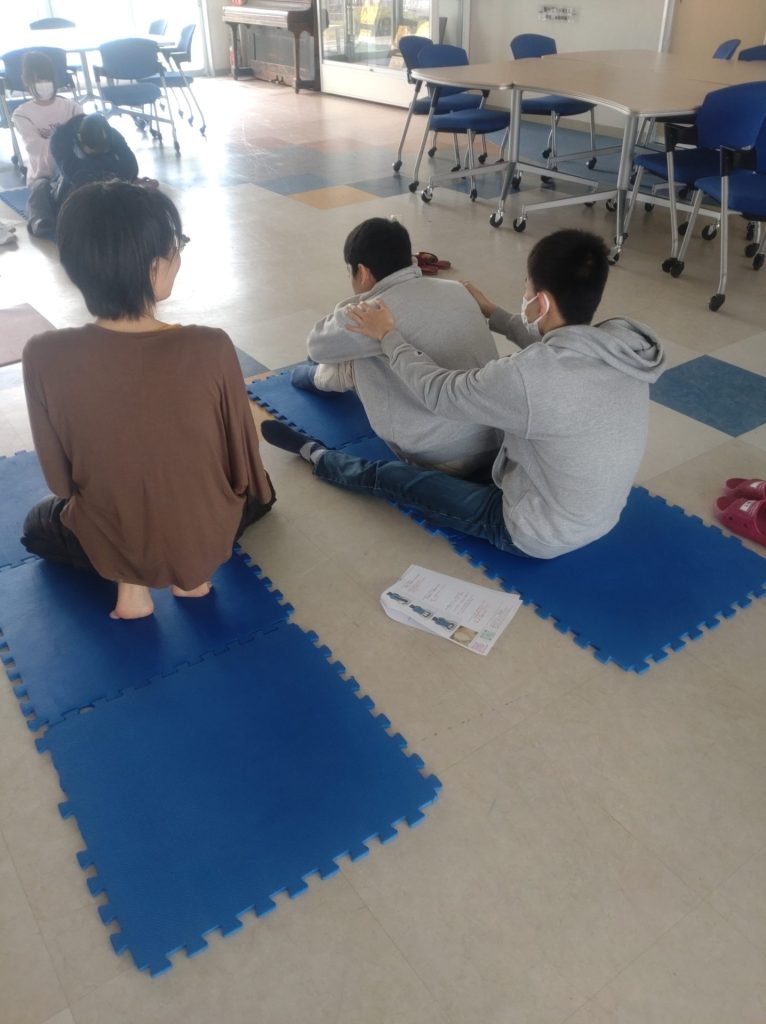 5月9日(金)4限目にヨガ講師の先生を招いて、本校飛躍にて2年生対象の「タッチセラピー」を行いました。最初に、裸足で飛躍横の芝生の上を歩きました。次に、飛躍の中に戻り、ゆったりとした音楽を流し部屋を薄暗くした中で、ヨガマットの上に仰向けに寝転がり身体の沈み具合を確認しました。その後、自分自身の手で身体を摩り、リンパの流れを良くしました。再度マットに寝転がり、身体の沈み具合の変化を体感しました。最後に、ペアになって背中をマッサージしました。生徒からは、「楽しく取り組めた」「身体と気持ちが軽くなった気がする」「家族にもしてあげたい」という感想がありました。