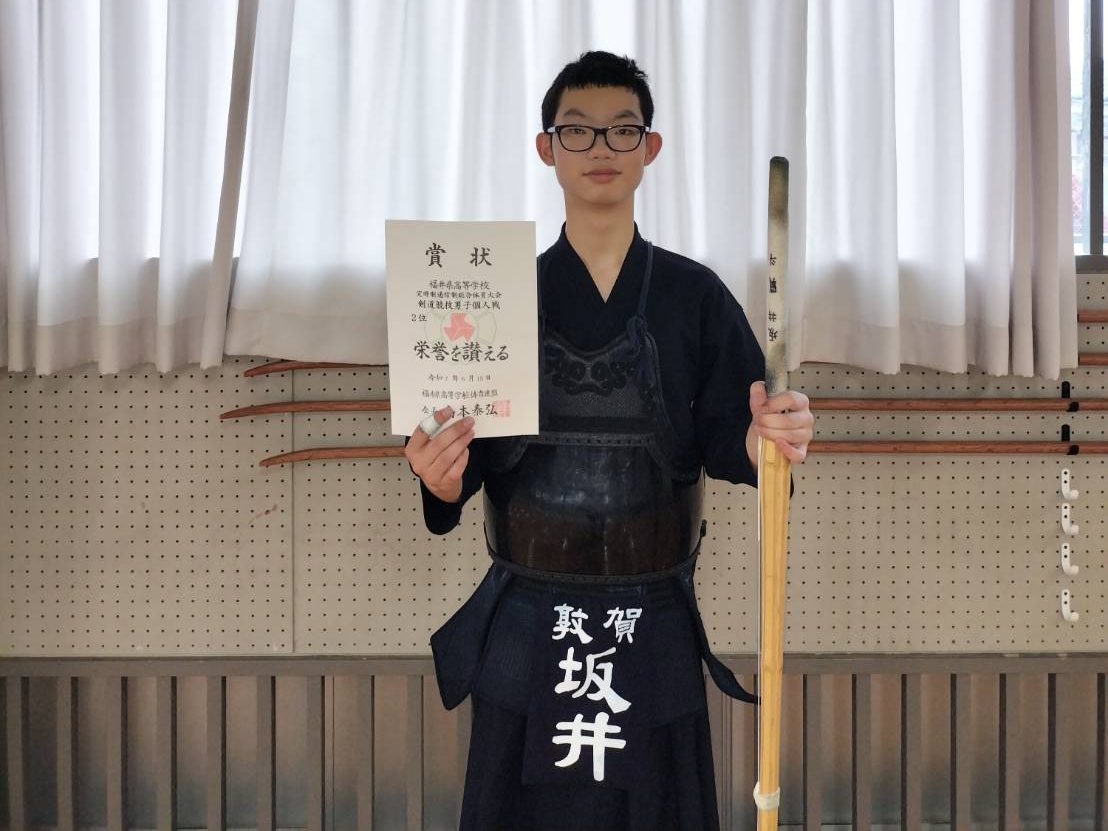 6月15日(日)鯖江高校武道館にて県高校定時制通信制総合体育大会剣道・柔道競技が行われました。全国大会をかけた大会です。本校からは、1年生の坂井翼斗が剣道に参加しました。相手は、道守高校の2年生でした。終始攻めの姿勢で戦う坂井に対して、カウンターを狙う道守高校の生徒でした。最後まで戦い続けましたが、道守高校の生徒に一本を取られてしまい負けてしまいました。それでも見事福井県2位での全国大会出場決定!坂井本人は、「全国2勝を目標に身体作りや技術の向上に努めます」と次への目標を設定して前を向いていました。また、「剣道をしていて賞状をいただくことは初めてなので嬉しいです」と安堵の笑みを浮かべていました。全国大会は、8月4日(月)に日本武道館で行われます。全国大会での活躍を期待しています。