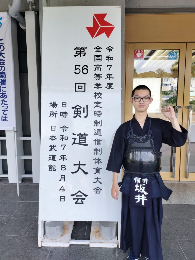8月4日(月)東京都の日本武道館にて全国高等学校定時制通信制体育大会第56回剣道大会が行われました。本校からは、1年生の坂井翼斗さんが福井県代表として個人戦に参加しました。相手は、岡山県代表の2年生でした。4分3本勝負(2本先勝)で行われました。武道の聖地である日本武道館で堂々とした戦いぶりでした。結果は、相手に2本先取され、一回戦敗退でした。前日からしっかりとイメージトレーニングをして臨んだ試合でしたが、相手の方がスピードも技の精度も上でした。坂井さん本人は、「全国大会のレベルを身をもって知ることができました。自分にはまだまだ練習が必要。来年も全国大会に出場できるように鍛錬します」と経験できたことの喜びと負けた悔しさを語ってくれました。11月には北信越大会が福井県で開催されます。更なる飛躍を期待しています。