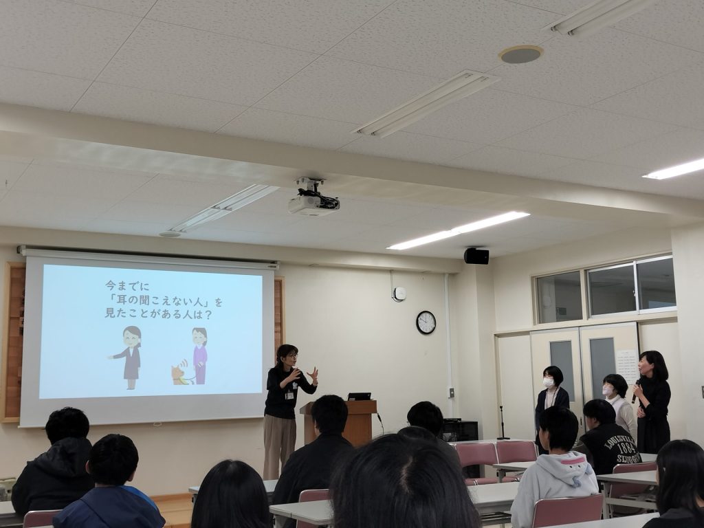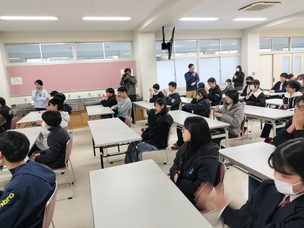 12月10日(水)の4限目にコミュニティルームにて福井県ろうあ協会会長の遊津貞美子様に講師として来ていただき手話教室を開催しました。「分かった」「分からない」「大丈夫」という手話を教わり、全員で手話を覚えました。その次は、日常で使う色々な挨拶を勉強しました。さらに、災害が起きた時に耳が聴こえない方にとっては非常に分かりにくく、大変な状況にあることを学びました。その状況に遭遇した時に自分には何ができるだろうということを生徒一人ひとりが考えたことと思います。最後に教室に戻ってから指文字のプリントを受け取り、自分の名前を指文字で表現している生徒もいました。障害がある方々と共に生きる術を学べた1時間でした。
