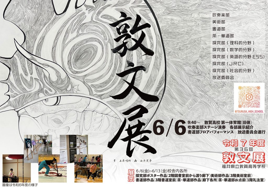 敦文展(案内) 2025年5月27日 最終更新日時 : 2025年6月9日 cmsadmin17 6月6日(金) 8:40~ 展示鑑賞 9:40~ ステージ・フロアパフォーマンス(旧体育館にて) 書道部 書道パフォーマンス披露 吹奏楽部 演奏発表 10:40~15:00 その他、各部展示、茶華道部のお点前など、お楽しみください。 Follow me! Copy