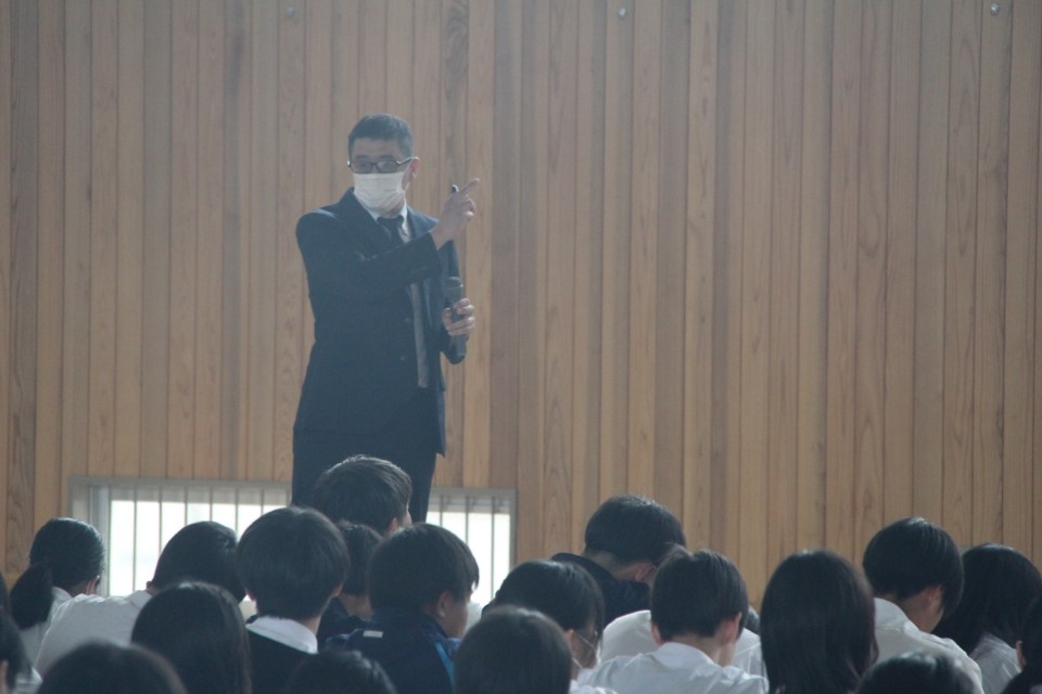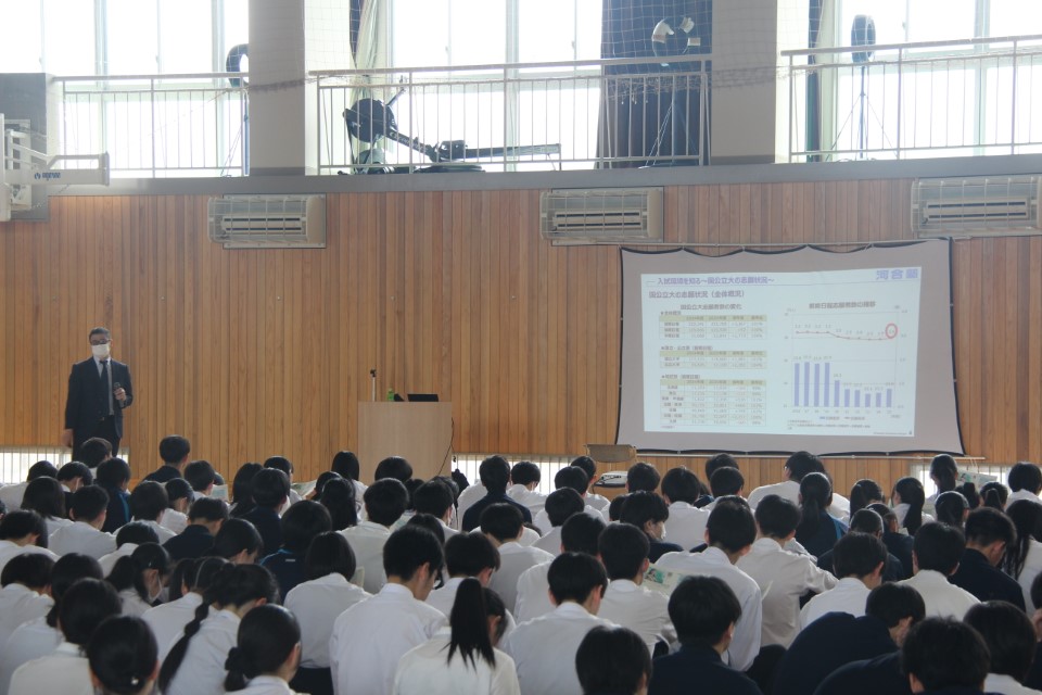 進学を希望している生徒へ向けては、河合塾進学アドバイザーの亀井昇様をお迎えし、講演会が実施されました。講演会では、入試の最新情報や受験勉強法、模擬試験の活用法など、様々なノウハウをお話しいただきました。生徒たちは真剣に話を聞き、「自分ごと」として進路に向き合っていました。