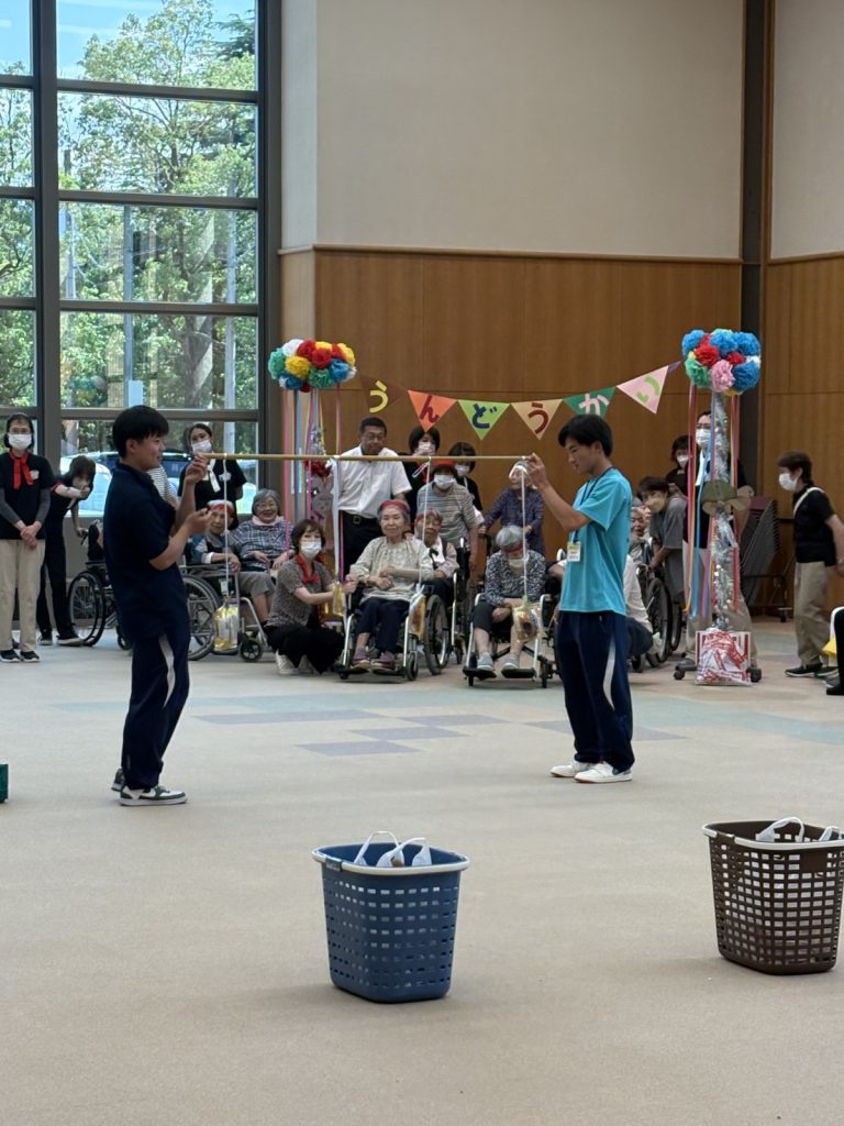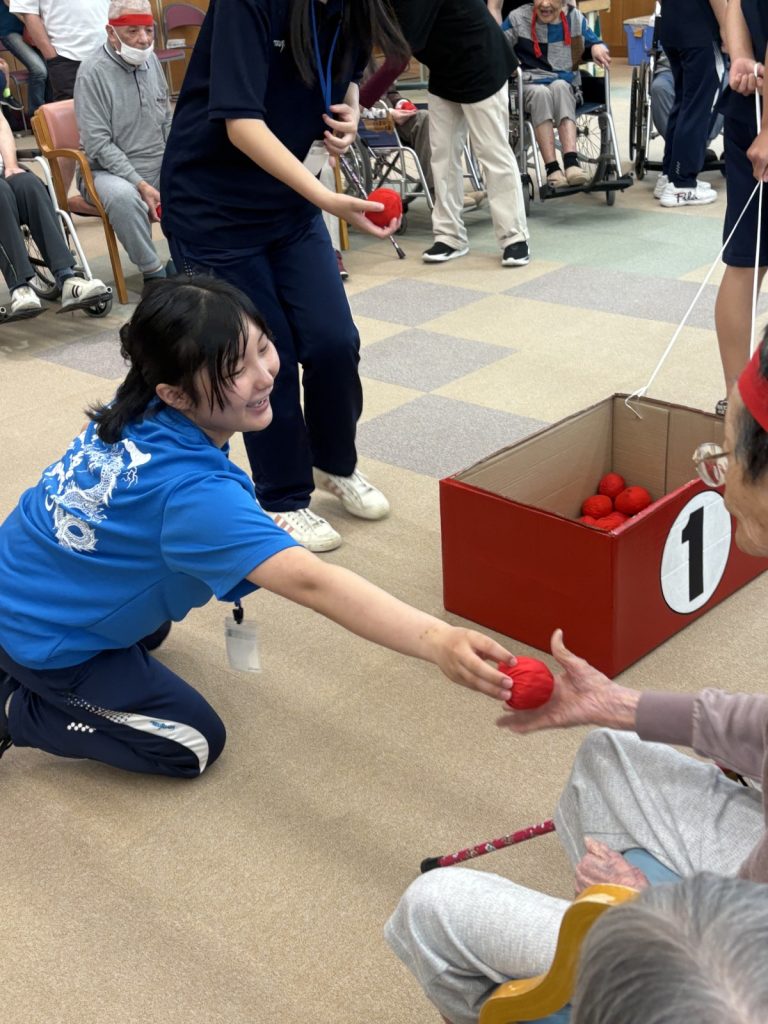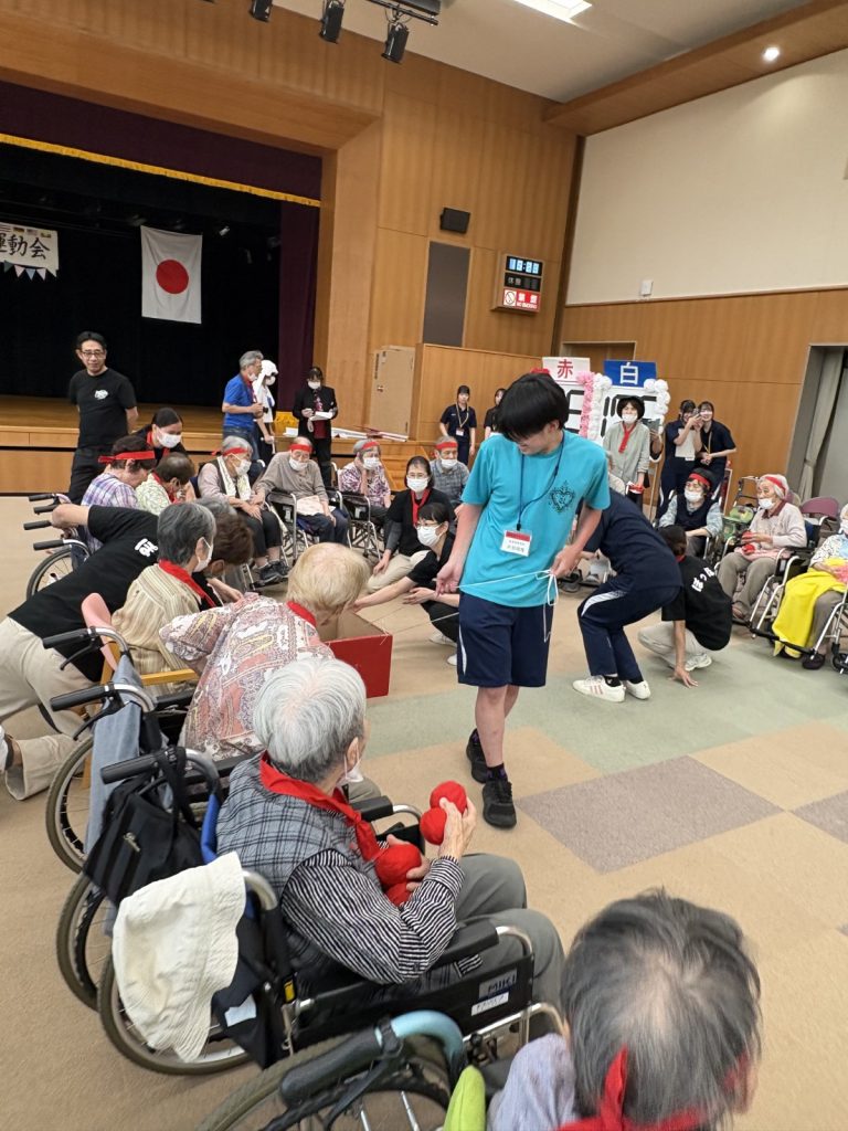 利用者さんたちの熱気と笑顔に迎えられ、玉入れやお菓子食い競争など、たくさんの競技を一緒に楽しみました。
